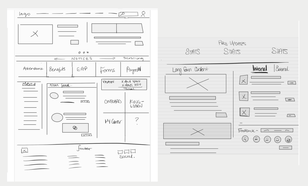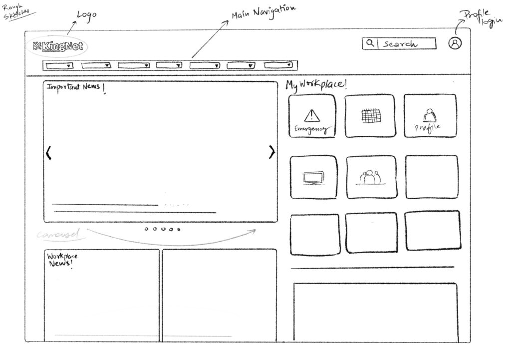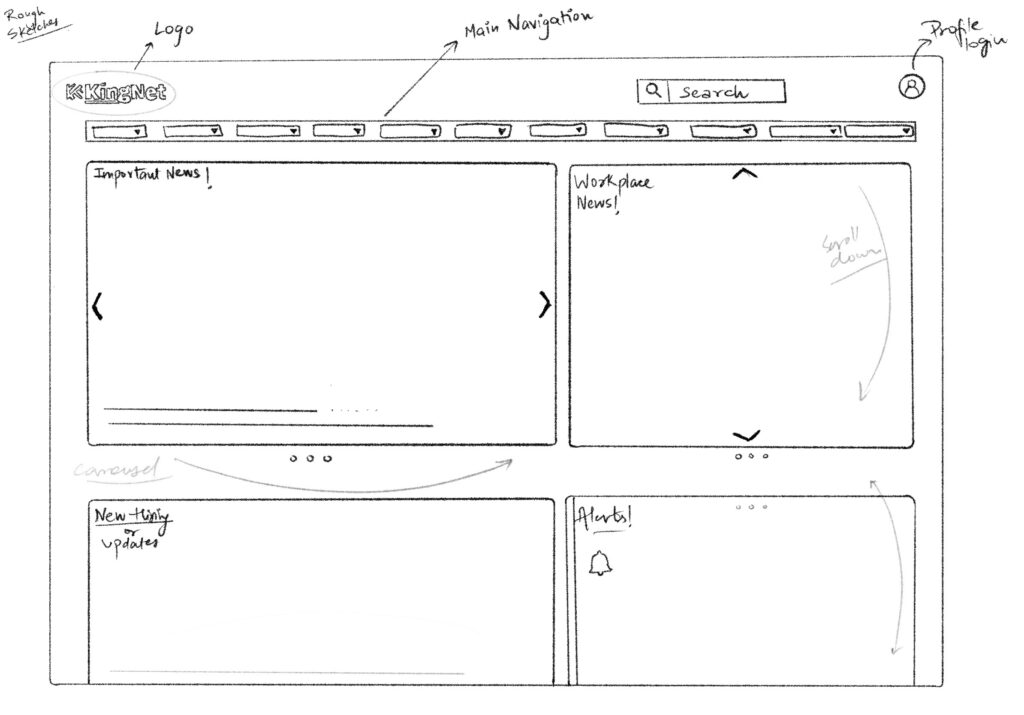 Our team developed preliminary sketches to explore design concepts and layout possibilities for KingNet. These sketches allowed us to visualize different interface options and iterate quickly based on stakeholder feedback and user requirements. They served as a foundational step in translating our design ideas into detailed wireframe prototypes for KingNet 2.0.
