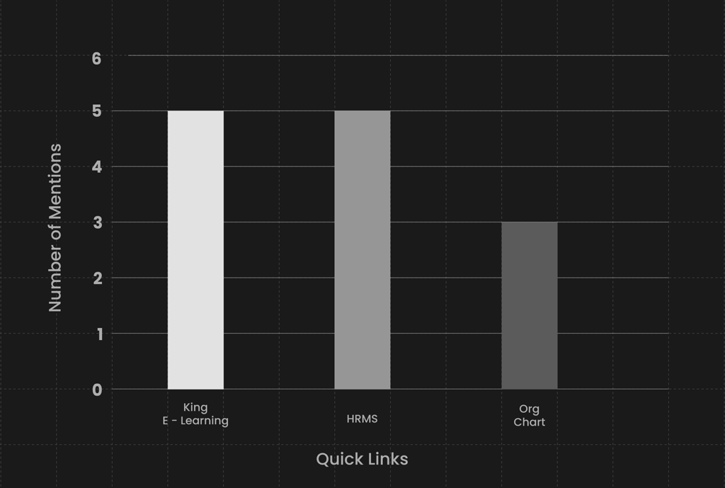 Building upon the insights gathered in Phase 1 and the finalized Information Architecture (IA) for KingNet,our group was directed to focus on refining the home page and employee essentials page. We conducted a survey among employees, including new hires, to gather quantitative data on their preferences and experiences with KingNet. The survey aimed to uncover the most sought-after resources, assess usability, and gauge overall user sentiment. Analyzing the results, we found unanimous identification of key resources like King e-Learning, highlighting their importance. Preferences for quick links varied, indicating diverse user needs. Users expressed expectations for essential content on the home page and emphasized the importance of access to vital information on the My Essentials page, informing design decisions to better meet user expectations.